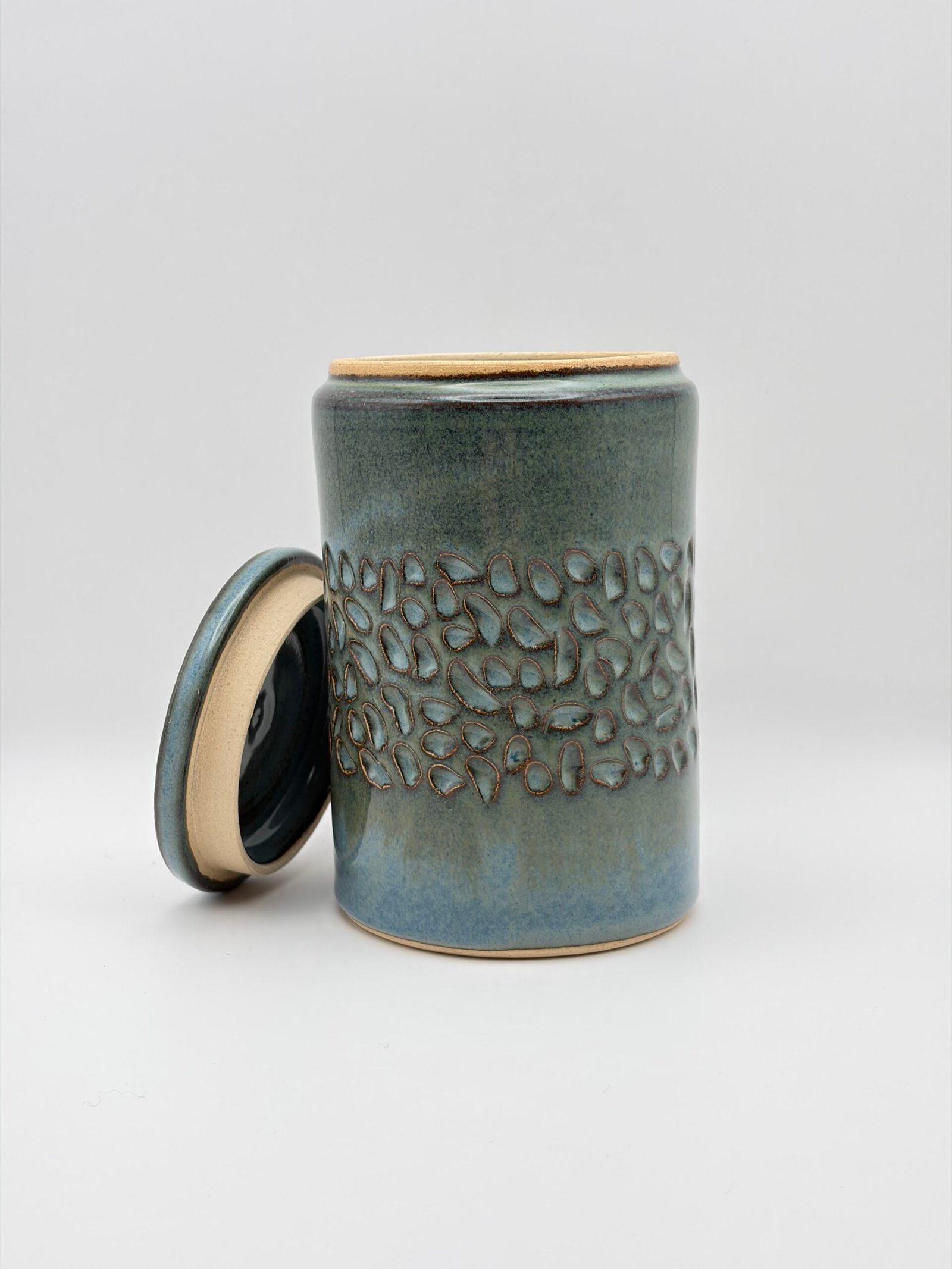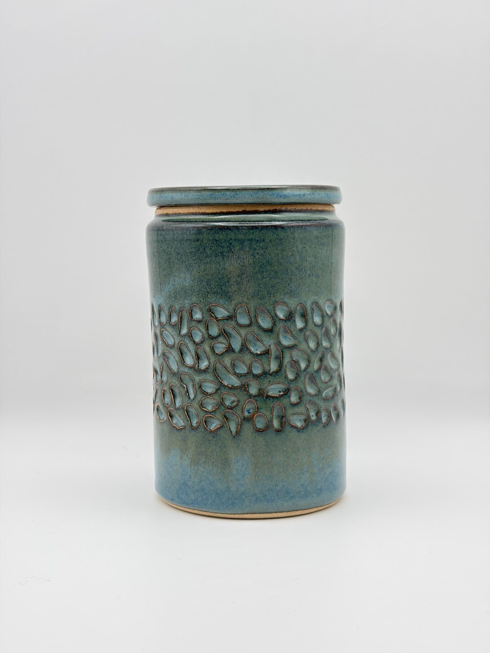 Be the first to review “Lidded Jar. Textured Design. In Blue Rutile.”